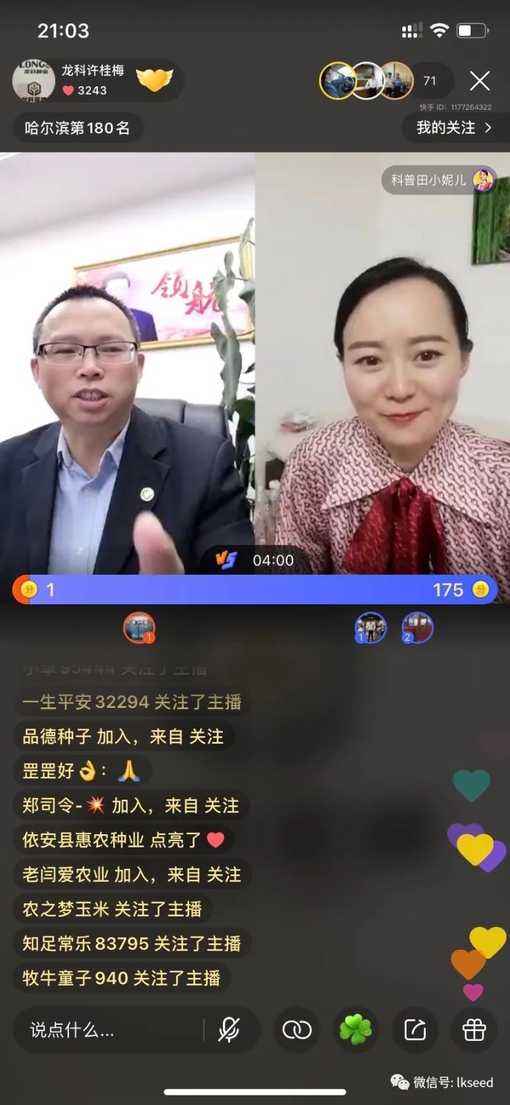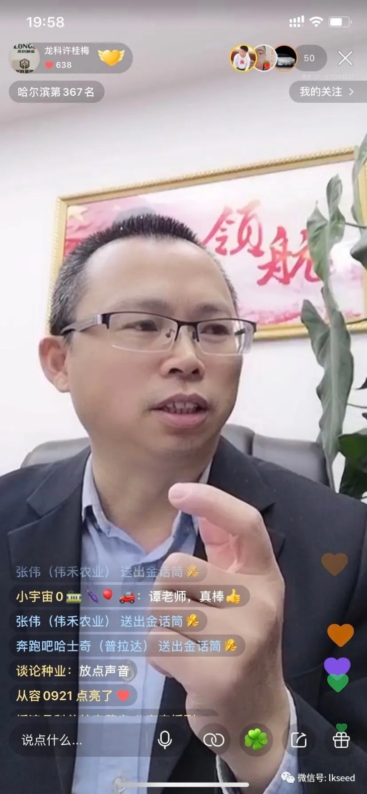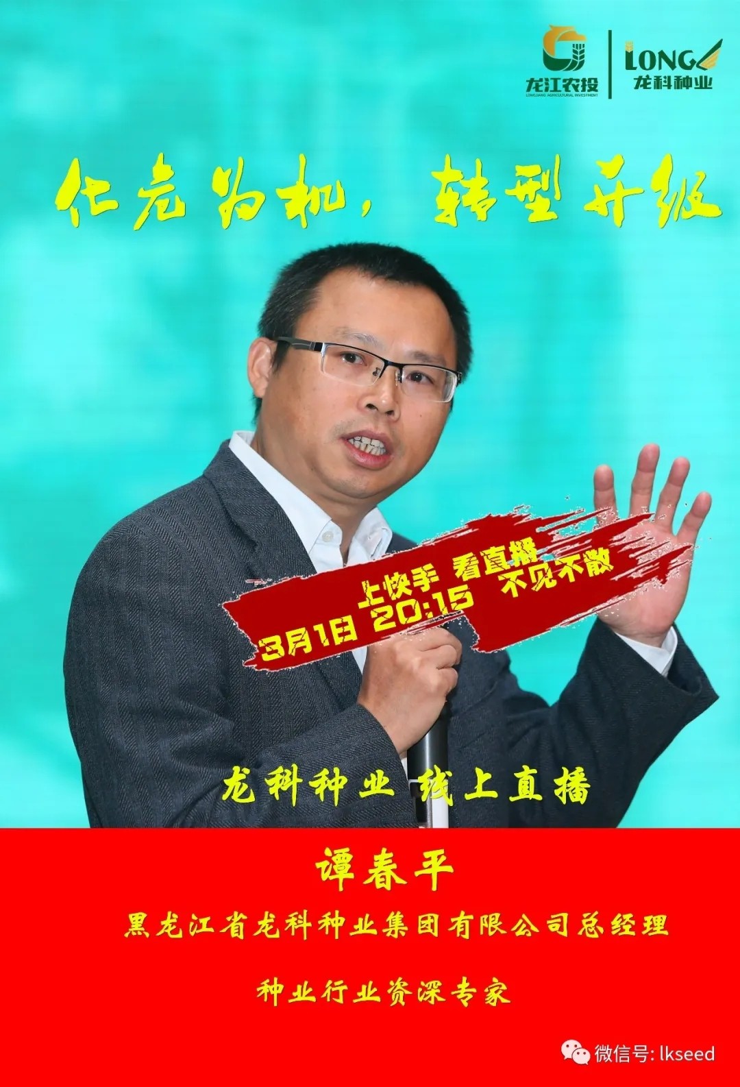 3月1日晚間8點,黑龍江省龍科種業(yè)集團有限公司總經(jīng)理譚春平做客快手平臺直播間,通過線上直播的形式,分析2020年我省備春耕農(nóng)業(yè)生產(chǎn)形勢、種業(yè)市場的供求趨勢,現(xiàn)場解答觀眾提問,推薦優(yōu)質農(nóng)作物品種和種植技術。譚春平總經(jīng)理認為:疫情之下,大家對今年我省農(nóng)業(yè)生產(chǎn)要堅定信心,不要焦躁,更不要悲觀。雖然抗擊疫情形勢嚴峻,但我們積極響應中央、省政府號召,在省農(nóng)投集團黨委的統(tǒng)一部署下,做好充分準備,為全省廣大農(nóng)戶準備了充足的生產(chǎn)用種。目前,龍科種業(yè)全體員工正加緊生產(chǎn),積極調(diào)運,全力保證各地的大豆、水稻、玉米的種子供應。為保證2020年我省糧食生產(chǎn)再奪豐收,保障國家糧食安全貢獻力量!同時,也建議要將這次疫情作為調(diào)整農(nóng)業(yè)種植結構、生產(chǎn)方式、經(jīng)營模式一次轉型升級的機遇。積極轉變思維、開拓新模式,各種子企業(yè)要好內(nèi)功,快速向移動互聯(lián)思維模式轉型。積極開拓種子的線上銷售渠道,利用微信、直播等形式創(chuàng)新營銷模式,為我省農(nóng)業(yè)生產(chǎn)提供種子保障。龍科種業(yè)此次大講堂活動,就是要讓經(jīng)銷商、廣大農(nóng)民對公司、對農(nóng)業(yè)充滿信心。隨后連線黑龍江廣播電視臺——公共?農(nóng)業(yè)頻道主持人田妮的直播間,為田妮直播間的觀眾解讀、分析國家農(nóng)業(yè)政策。此次直播吸引大量人員在線觀看,積極參與現(xiàn)場公屏互動,場面十分火爆、熱烈。